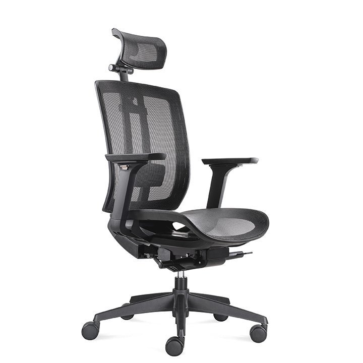 Assento e encosto em tela que permite realização de uma troca térmica com o ambiente, sendo o apoio de cabeça articulado e também em tela. braços com regulagem de altura em múltiplos e deslizamento do apoio em poliuretano. mecanismo syncron de múltiplos pontos de parada, que permite deslizamento do assento, regulagem de profundidade e ajuste de tensão. base em nylon, com design piramidal e rodízios também em nylon.